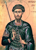 Святий Теодор Тирон (ім'я його означає "новобранець") був родом з Вірменії і служив у римському війську. Побожний Теодор не приховував своєї християнської віри. На суді він мужньо заявив, що Ісус Христос є правдивим Богом. |